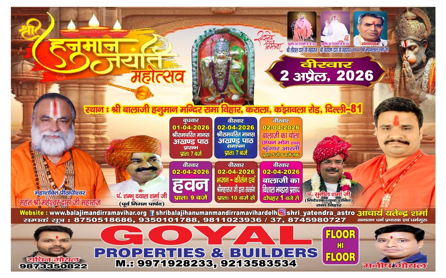 इस मंदिर के विस्तार से पहले रामा विहार कॉलोनी के संस्थापक, कोटपुतली राजस्थान निवासी, अखिल भारतीय ब्राह्मण महासभा अध्यक्ष स्वर्गीय पंडित मदन लाल शर्मा मेहन्दीपुर जाते रहते थे। वहा के महंत स्वर्गीय श्री रामस्वरूप पुरी जी को इस स्थान पर लेकर आये और उनको इस क्षेत्र में घुमाया, उन्ही के साथ उनके कृपापात्र शिष्य श्री महेश जी भी थे। इस स्थान पर महंत रामस्वरूप जी खड़े हो गये और अपने शिष्य को इस स्थान का महंत बना दिया उसके पश्चात महेश जी के पिता ब्रह्मलीन संत श्री नारायण दास जी जो कि एक तपस्वी संत थे उन्होंने यहा धूना लगाया और महेश जी महाराज द्वारा दरबार लगाया जाने लगा। इस तरह से मंदिर का निर्माण और विस्तार हो गया। मंदिर में तीन अखंड ज्योति जल रही है जो मेहन्दीपुर धाम से लायी गयी है, श्री बालाजी महाराज, श्री भैरव जी और श्री प्रेत राज सरकार की।